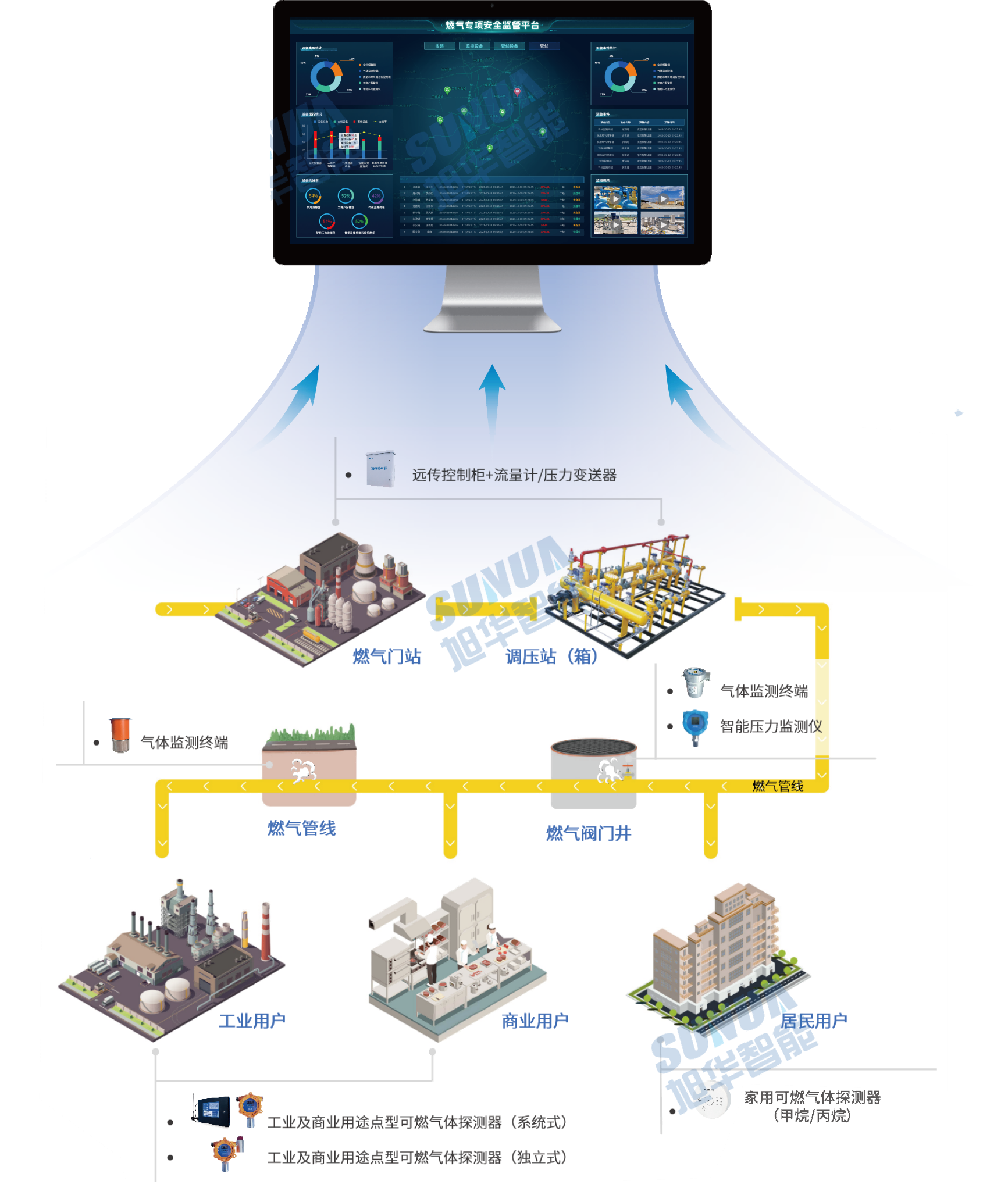 燃气安全一站式解决方案,覆盖从居民、工商业等终端用户,到管网、场站、燃气公司,再到政府监管的产业链各个环节,可依托点、线、面、体,四维一体的监测预警产品为燃气安全建设保驾护航。