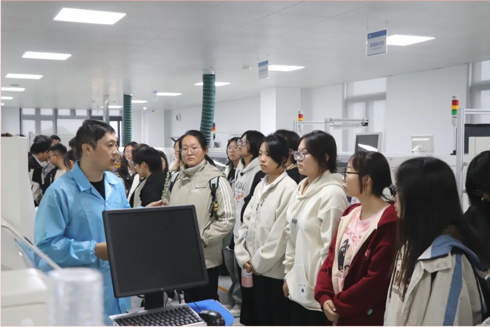 接下来,师生们来到生产车间,生产部经理孙志民向大家介绍了生产线的基本布局、工作流程以及安全生产的重要性。让学生们对生产企业的生产流程有了直观地认知和体验。